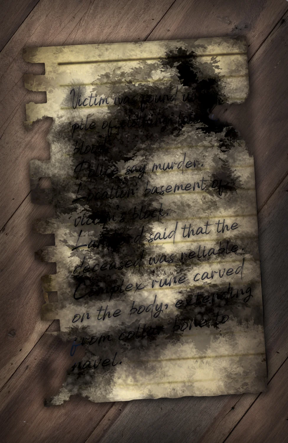 He pushed the photo to the side to scan the page, hoping to stimulate his memory, but the paper was badly stained. Deep black blotches obscured most of the text, leaving nothing but scattered words and phrases. The remaining words were so truncated that they did little to jog his memory. “Victim was found… murder… basement… said that the… carved on the bo–”