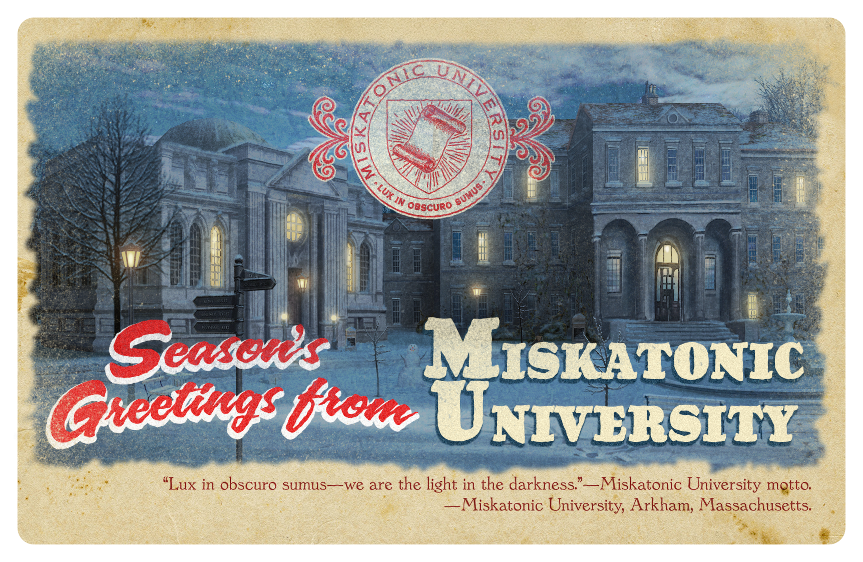 If there’s one place you can count on to be filled with festive good cheer, it’s Miskatonic University campus. Wish friends and family Happy Horror Days from the serene surroundings of the entirely safe quad.