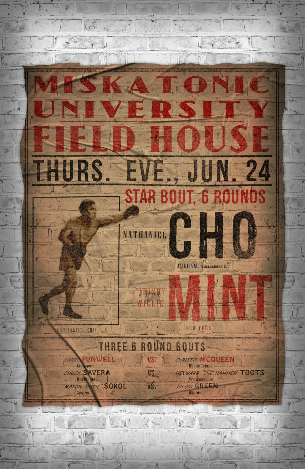 When Nathaniel exited the locker room, wet hair slicked back from his forehead, he was relieved to see Dutch standing next to a pile of training mats. The bridge of the enormous boxer’s nose had split and one eye mostly swollen shut. Nathaniel gestured toward them with a grimace.