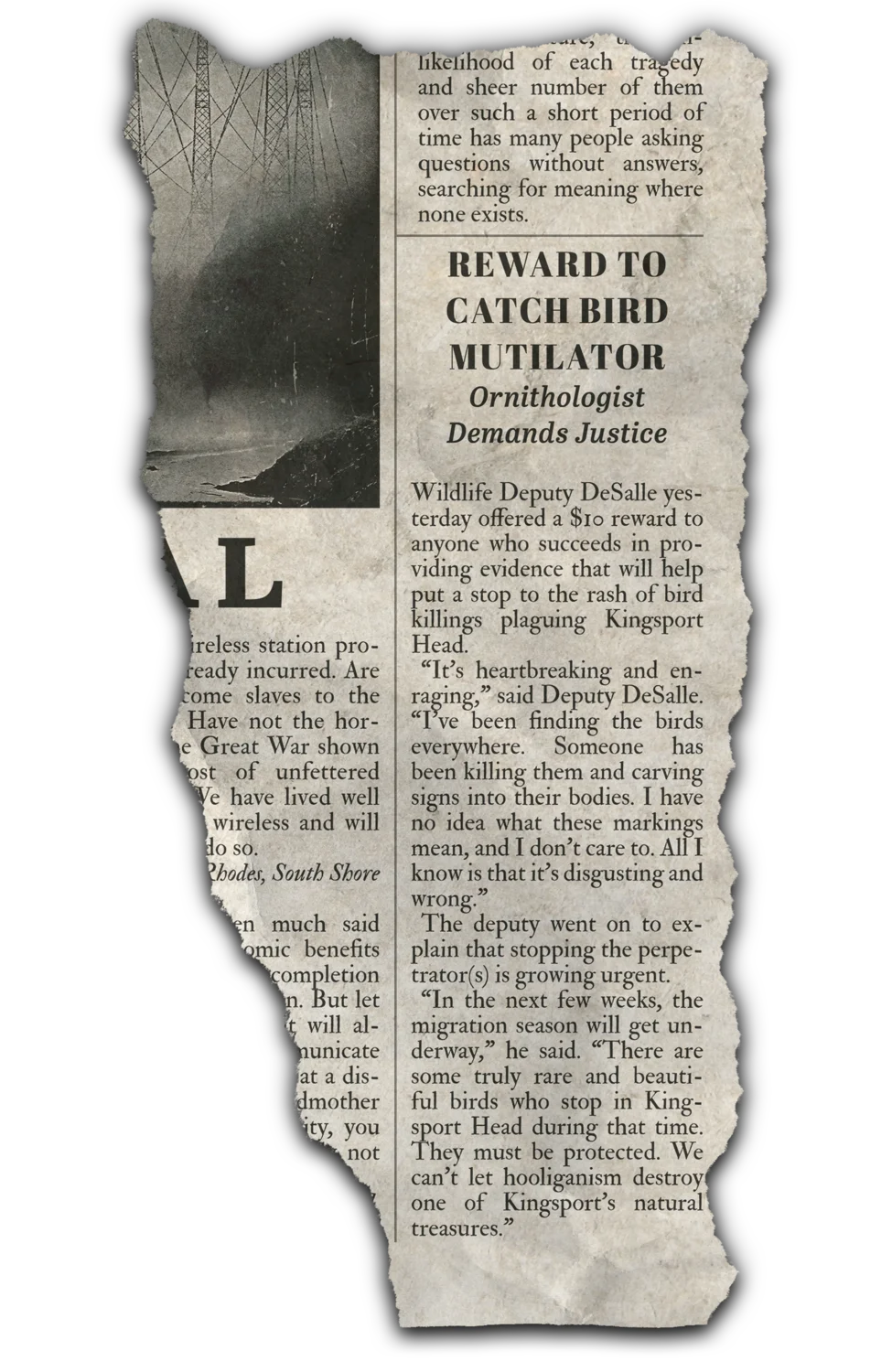 Wildlife Deputy DeSalle yesterday offered a $10 reward to anyone who succeeds in providing evidence that will help put a stop to the rash of bird killings plaguing Kingsport Head.