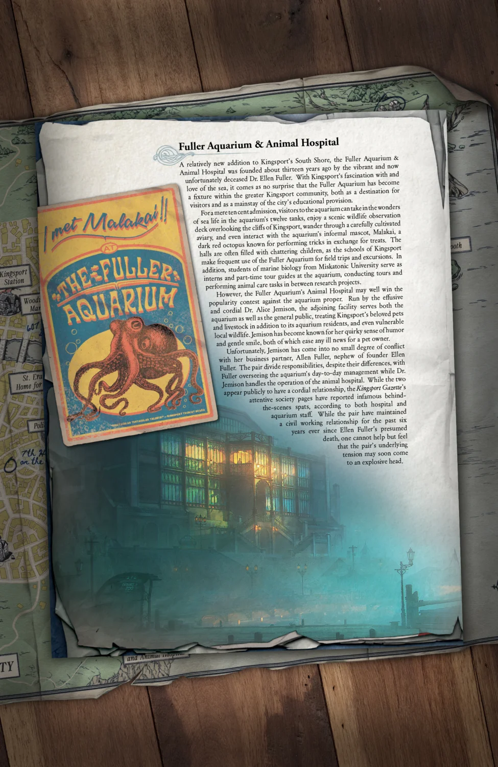 Explore Fuller Aquarium and the mist-wreathed mysteries of Kingsport in Dreams of Kingsport, the new setting guide for Arkham Horror: The Roleplaying Game. Learn more here.
